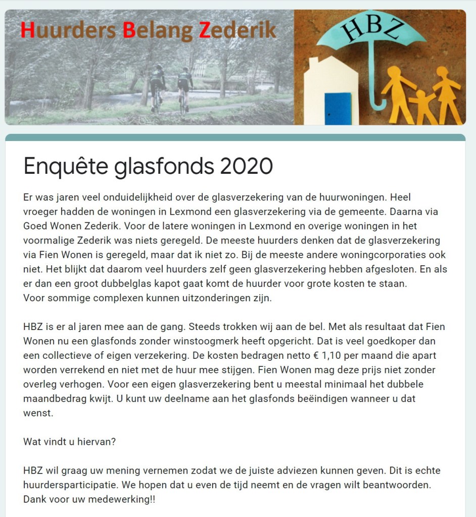 Wij hebben een enquête gemaakt. En deze enquête is door een aantal huurders ingevuld. Deze enquête was verdeeld in 3 blokken, waarvan het laatste blok over HBZ niet ingevuld hoefde te worden als u dat niet wenste.