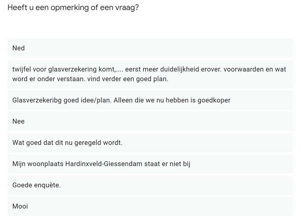 Het is gebleken dat de woningen van Fien Wonen in het voormalige Zederik geen glasverzekering hebben. Met uitzondering van wat oudere huurwoningen in Lexmond en een paar appartementencomplexen. De meeste huurders zullen hebben aangenomen Fien Wonen een glasverzekering heeft dat dit in de huur zat verwerkt. Dat is niet zo en bij veel andere corporaties ook niet. Er is wel een opstalverzekering maar die dekt geen glasschade.