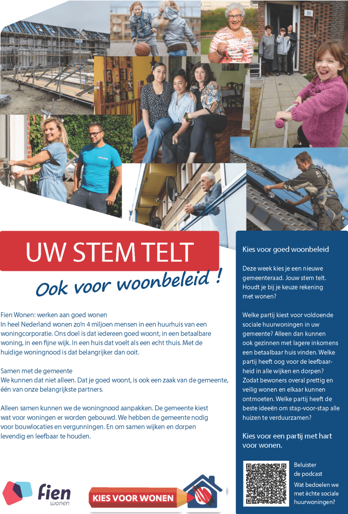 De gemeenteraadsverkiezingen gaan echt over jouw woonomgeving. Denk bijvoorbeeld aan voldoende sociale huurwoningen in jouw gemeente. Maar ook betaalbaar huren is een belangrijk onderwerp. Daarnaast gaan de gemeenteraadsverkiezingen over een fijne woonomgeving en over klimaatdoelstellingen. Het is dus belangrijk dat je stemt.