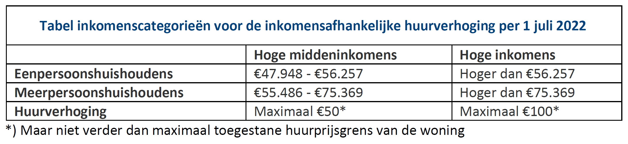 - Huurprijzen van huurwoningen waarbij het huishoudinkomen binnen de toelatingsgrenzen valt en waarvan de huren maximaal 10% onder de eerstvolgende aftoppingsgrens liggen, stijgen met maximaal inflatie 2,3% – 1% = 1,3%. De huren van deze woningen worden niet verhoogd tot boven de streefhuur tenzij er sprake is van huishoudens met een hoger inkomen (zie 3).