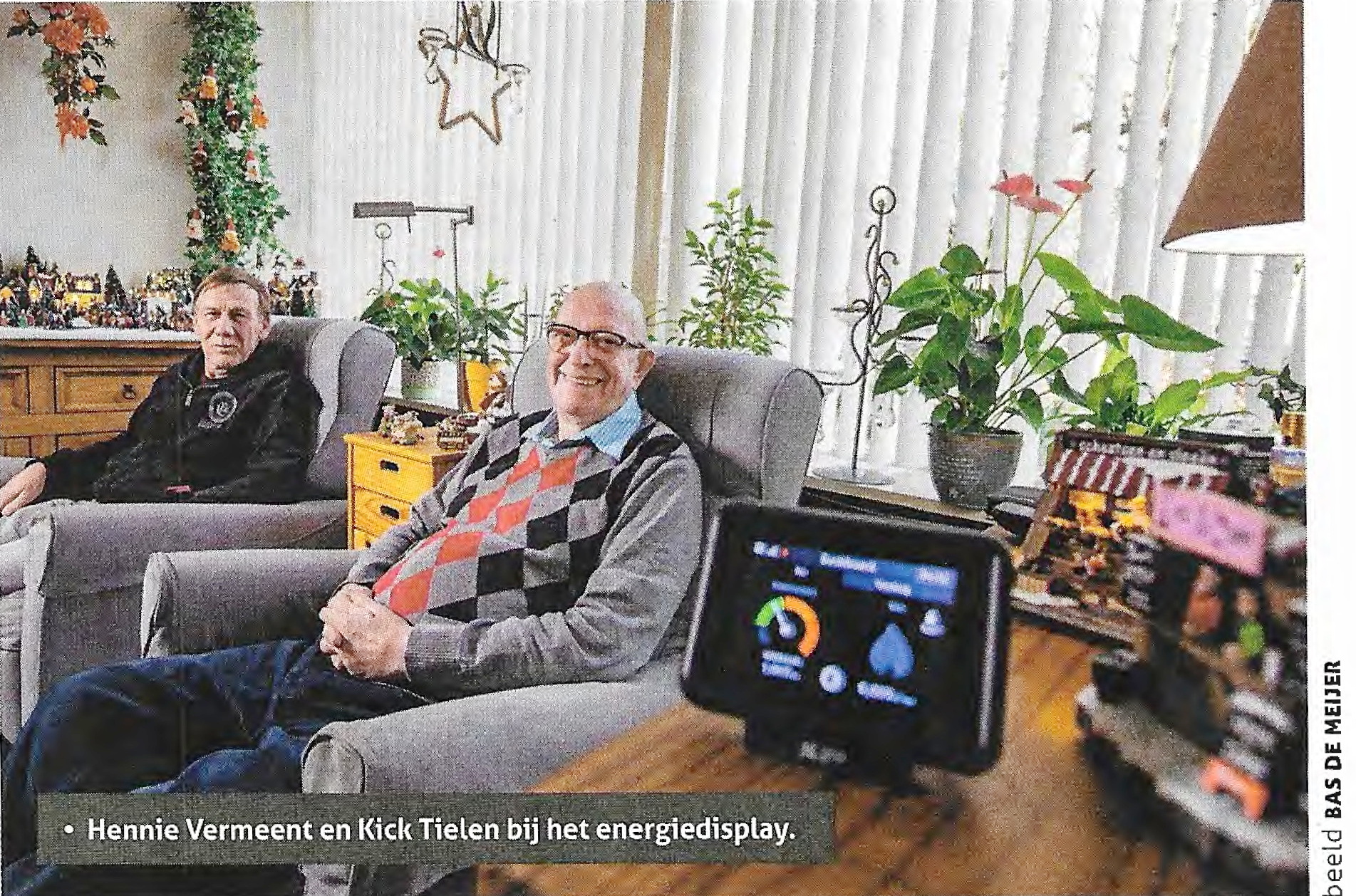 Zodra Kick Tielen in de keuken de waterkoker aanzet, springt de wijzer van het energiedisplay naast zijn fauteuil van groen naar oranje. ‘Zie je’, zegt hij enthousiast. ‘Je ziet gelijk hoeveel stroom of gas je verbruikt.’ Een half jaar geleden kreeg hij het display te leen van het energieteam Energie-U en woningcorporatie Cazas Wonen. Evenals zijn buurman Hennie Vermeent: ‘We waren beiden even kritisch: “Laat maar zien waarom we het display zouden moeten gebruiken.” We raakten al snel overtuigd. Het blijkt gewoon een goed apparaatje.’ Kick: ‘Je wordt je ervan bewust hoeveel kuub gas en kilowattuur stroom je verbruikt.‘ Links springt de stroomwijzer op groen, oranje of rood. Rechts groeit een blauw vlammetje van klein naar groot.
