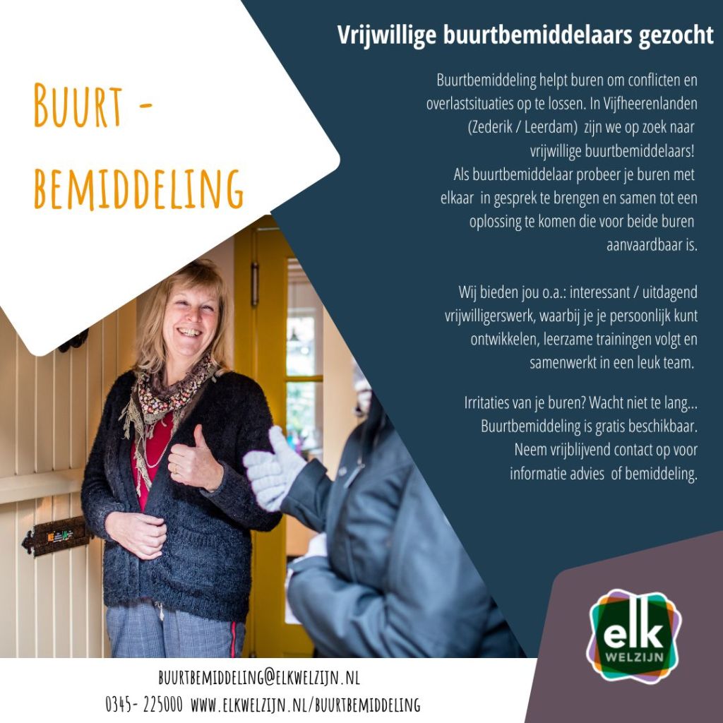 Meer info: https://elkwelzijn.nl/meedoen-en-ontmoeten/vrijwillig-buurtbemiddelaar
