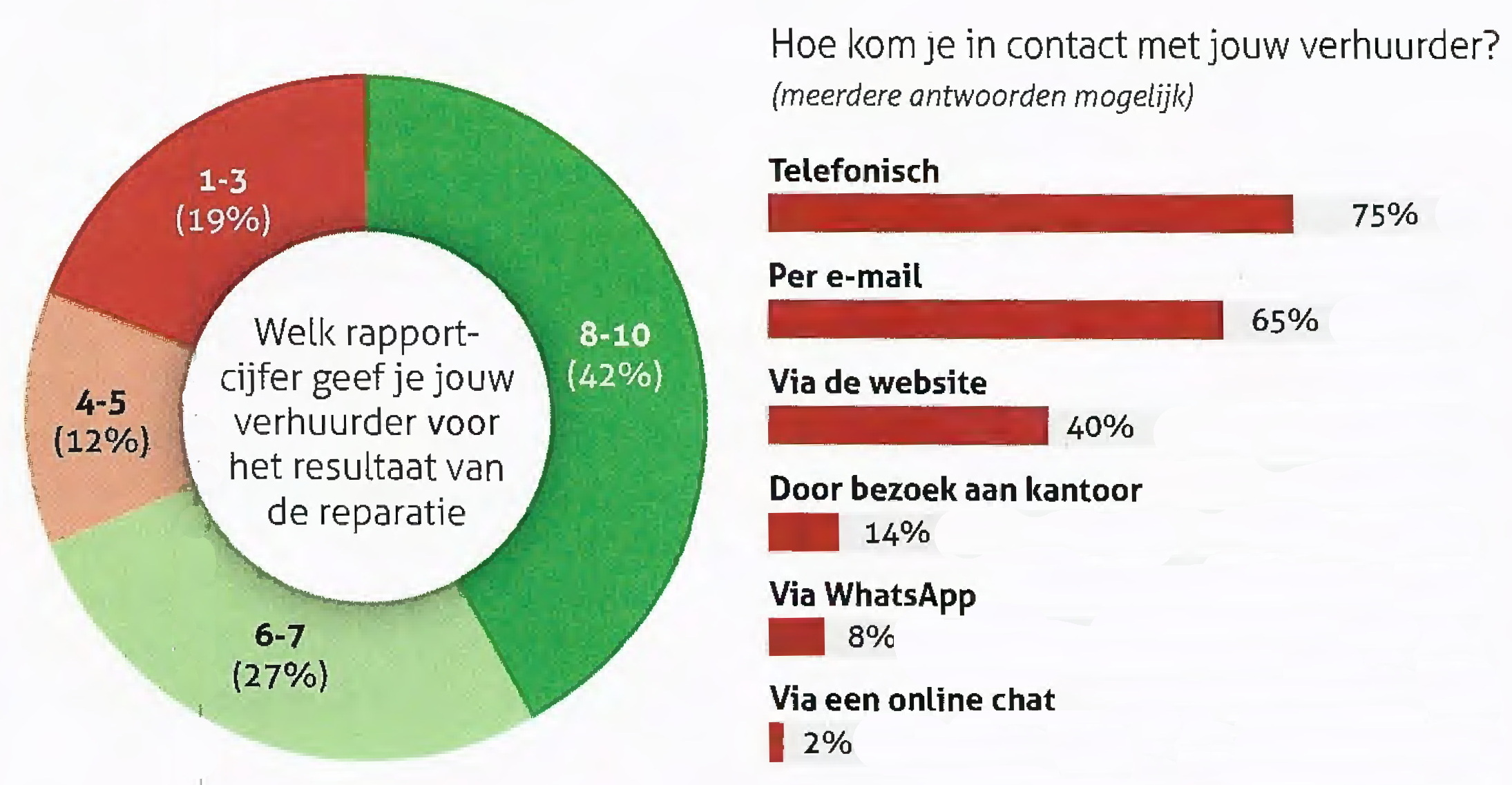 Het Woonbond-ledenpanel is uitermate kritisch over de dienstverlening van de verhuurders. De 429 panelleden geven hun verhuurder gemiddeld een 5,6 voor de snelheid waarmee algemene vragen ver de woning worden beantwoord, en een 5,5 voor de kwaliteit van het antwoord. Over de afhandeling van reparatieverzoeken is het panel slechts iets positiever: een 5,9 voor de snelheid waarop de verhuurder reageert, en een 5,8 voor de kwaliteit van het antwoord. De woningcorporaties presteren volgens het ledenpanel net iets beter dan de commerciële verhuurders. De corporaties komen gemiddeld rond de 6, terwijl de commerciële verhuurders rond de 5,5 blijven steken.