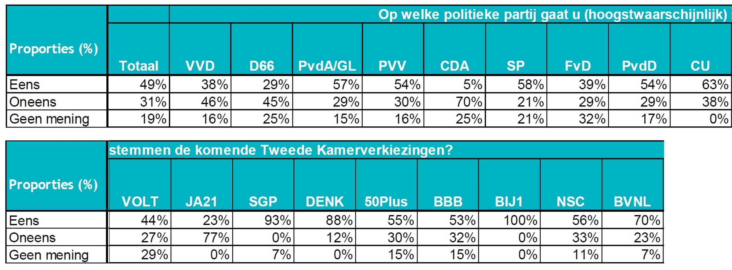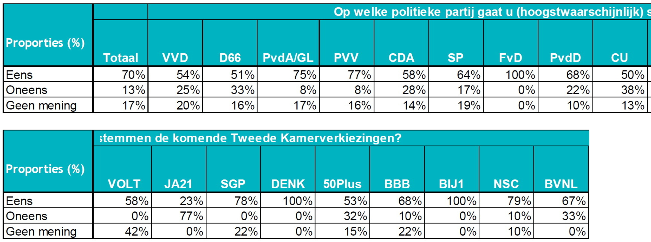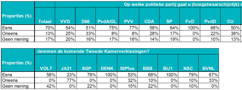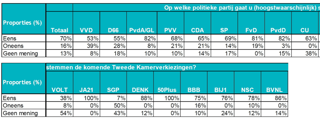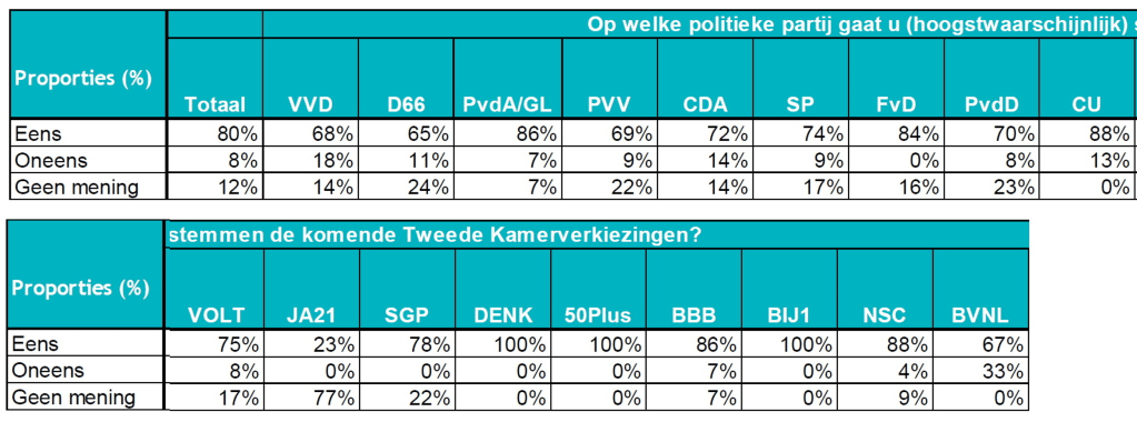 De onderzoeksresultaten zijn op totaalniveau representatief naar geslacht, leeftijd, opleidingsniveau en woonsituatie. De resultaten zijn gewogen naar stemgedrag bij de Provinciale Statenverkiezingen 2023. De weging is toegepast om te corrigeren voor eventuele over- of ondervertegenwoordiging van politieke voorkeuren. De resultaten op totaalniveau zijn betrouwbaar en representatief. De resultaten per politieke partijen indicatief: bij partijen met een klein aandeel kiezers is het aantal geënquêteerden klein, daarom dienen de percentages bij de kleinste partijen met terughoudendheid over genomen te worden. Bij grotere partijen zijn de percentages betrouwbaarder.