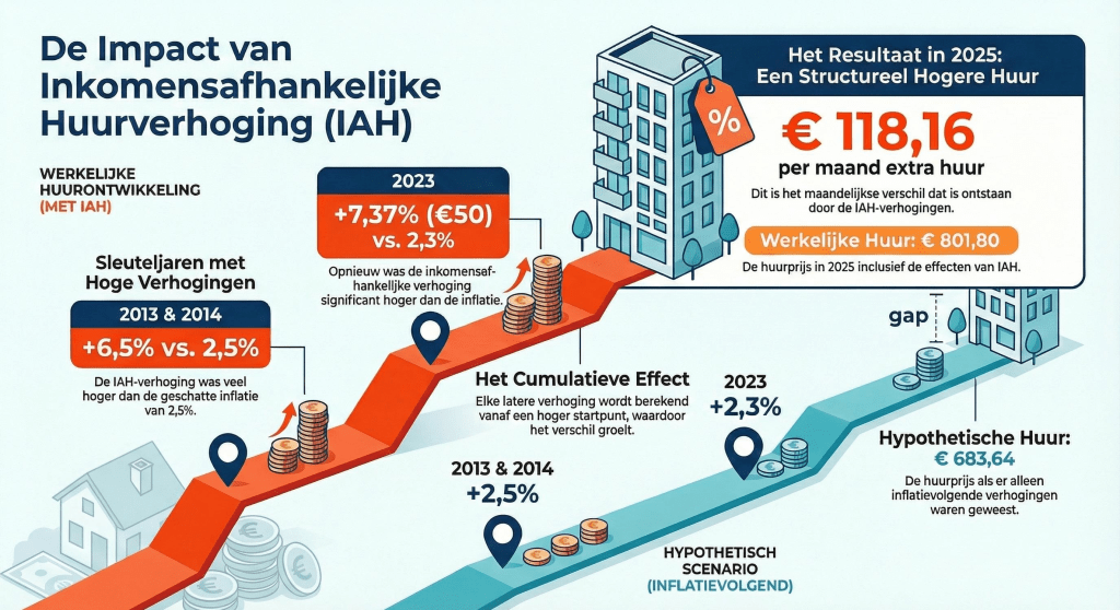 Dit is een voorbeeld van een huurder die vanaf 2013 te maken kreeg met de IAH. Het is steeds per jaar een aantal procenten extra huurverhoging. Het jaar daarop weer extra procenten, ook over de extra procenten van het jaar daarvoor. En zo zijn er over 10 jaar procent over procent (cumulatief) extra huurverhoging geheven: een verschil van €118,16 per maand. Dat is €1417,92 per jaar extra huurverhoging!