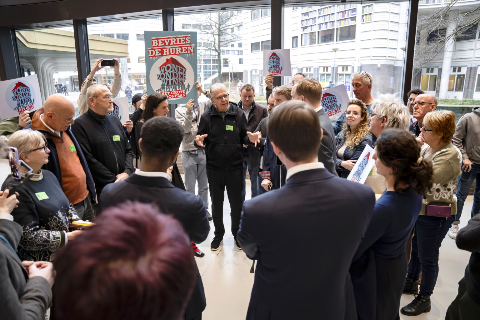 Ruim 40 huurders hebben woensdag 13-02-2025 in de Tweede Kamer geprotesteerd tegen de huurverhoging. De Woonbond organiseerde dit protest omdat de enorme huurstijging tot wel 7,7% oneerlijk en onbetaalbaar voor huurders is.