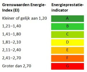 Deze tabel geeft een omrekening van energielabel naar energie-index weer.