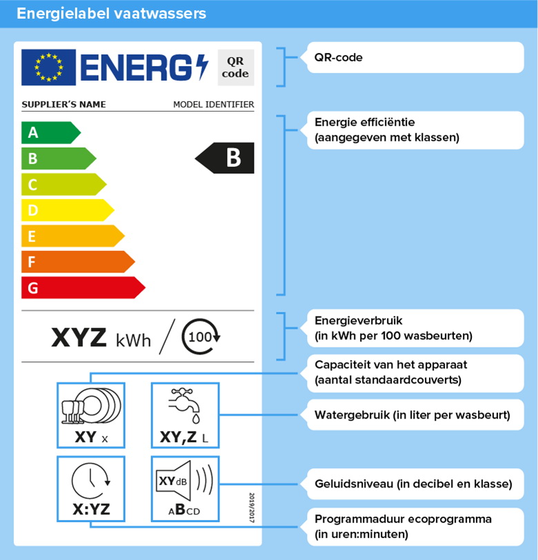Dit is een voorbeeld van het energielabel van een vaatwasser. Het label laat zien hoe zuinig de vaatwasser omgaat met energie. Behalve op de labelklasse (de letter) kan je ook letten op het energieverbruik per 100 afwasbeurten. Daarmee kan je verschillende modellen goed vergelijken. Verder vind je op het label informatie over het aantal couverts, het watergebruik en hoeveel geluid de afwasmachine maakt.