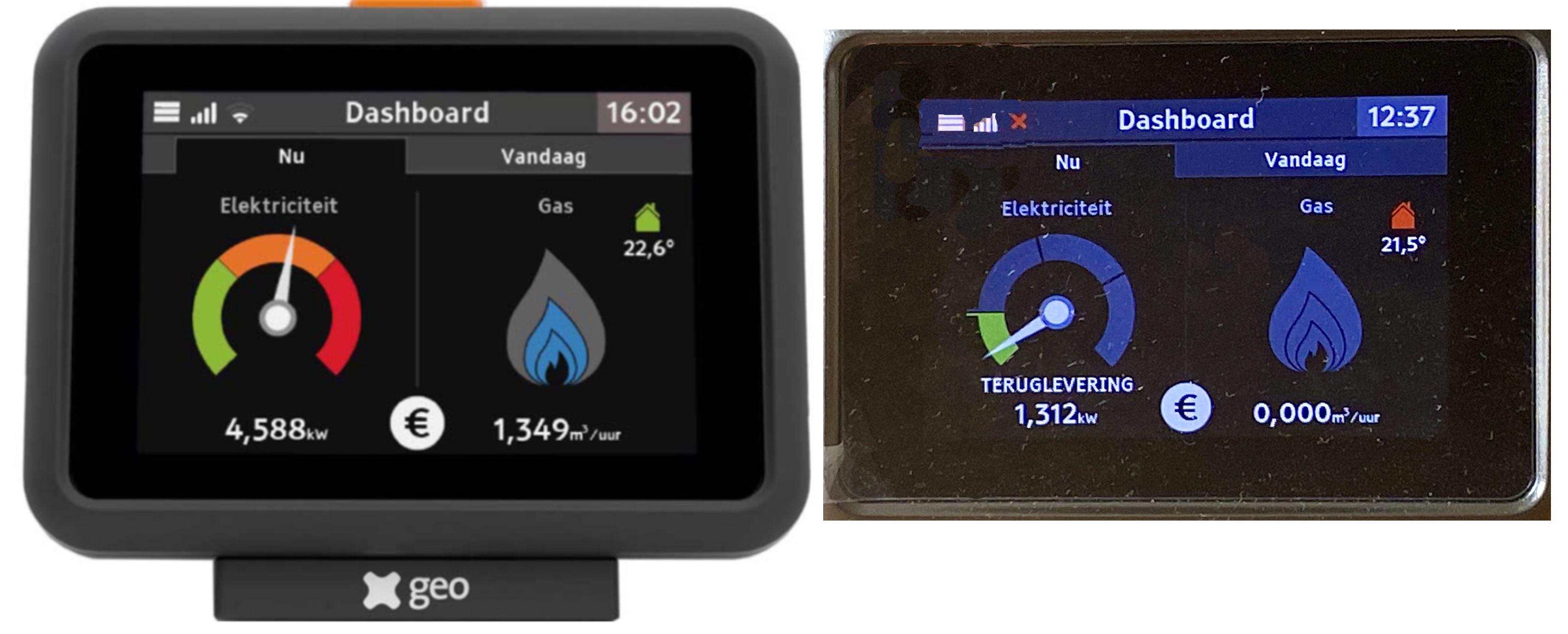 Een display laat zien wat je NU een stroom (zie de wijzer) en aan gas (zie de vlam) verbuikt. Als je zonnepanelen hebt is een enegiedisplay zeer interessant. Je ziet wat er aan stroom wordt teruggeleverd aan het openbare net, zie de rechter foto.