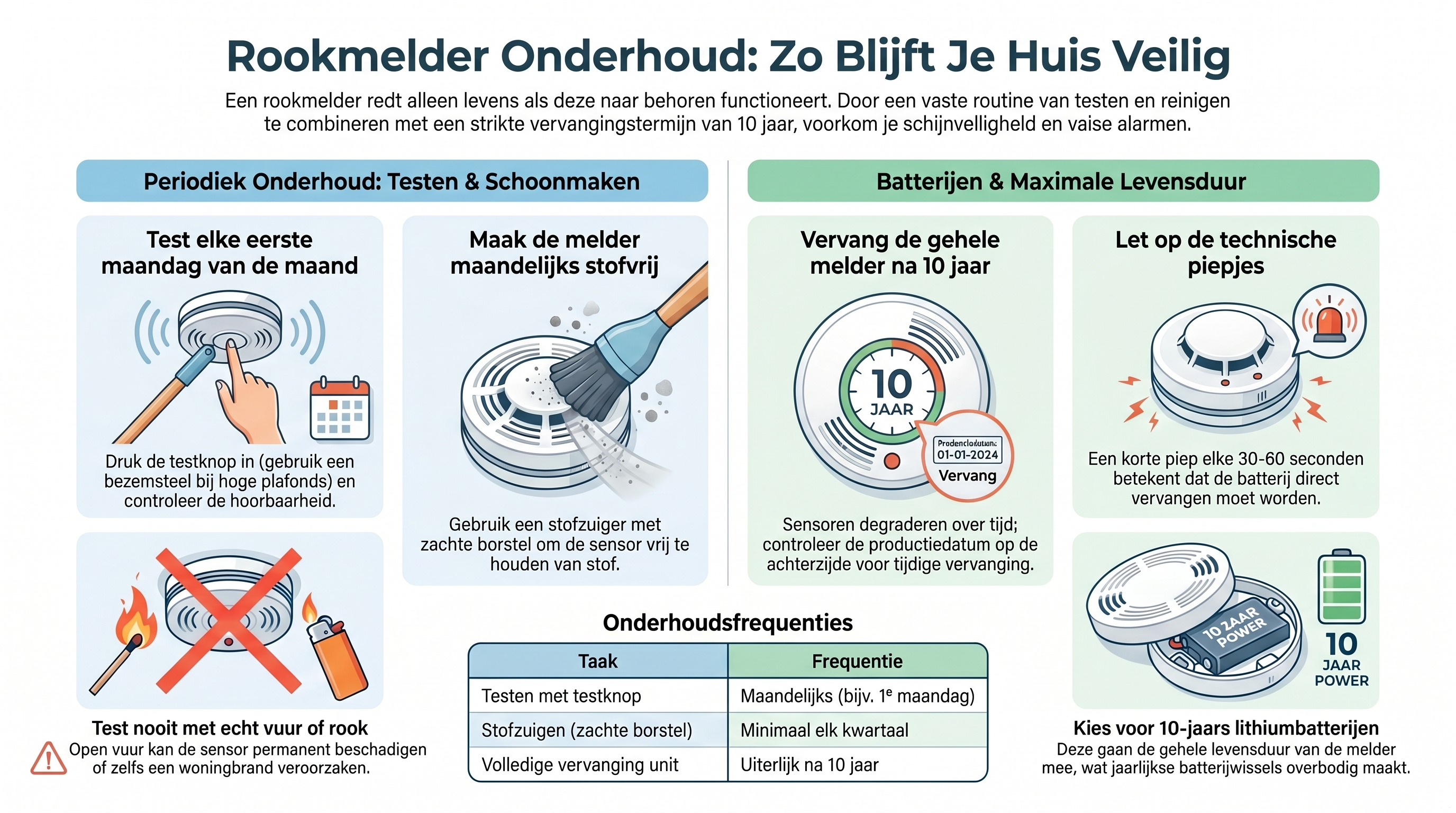 - Nooit testen met echt vuur: Gebruik nooit open vuur, kaarsen of echte rook om de melder te testen. Dit kan de melder permanent beschadigen of zelfs een echte woningbrand veroorzaken.